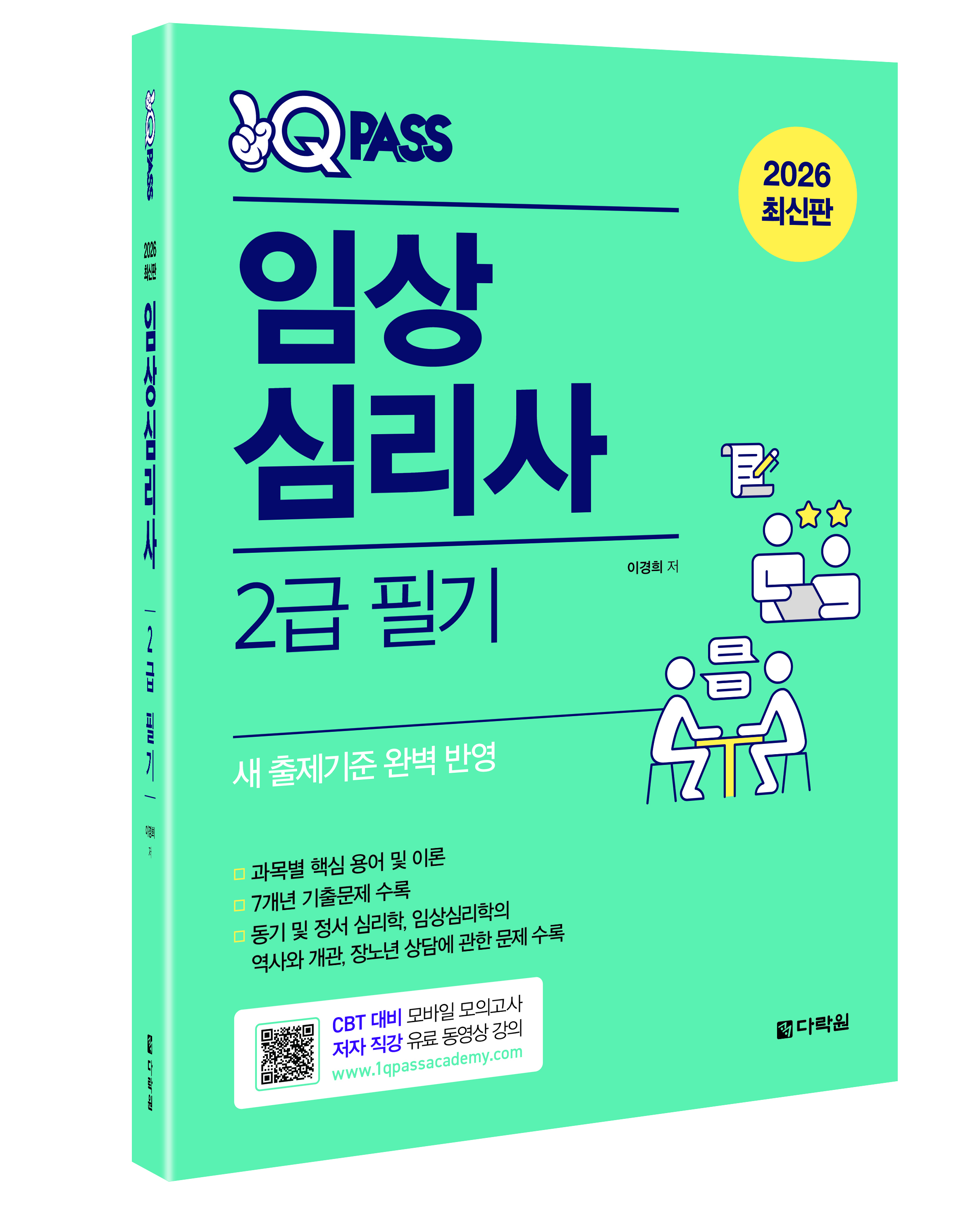임상심리사 2급 필기 합격의 지름길은 원큐패스이다. 지속되고 있는 코로나 시대에 여러 분야에서 심리적 고통을 호소하는 일이 더욱 더 잦아지고 있는 시대에 꼭 필요한 직업 중의 하나가 임상심리사이다. 임상심리사는 인간의 심리적 건강 및 효과적 적응을 다루어 궁극적으로는 심신의 건강 증진을 돕고, 심리적 장애가 있는 사람에게 심리평가와 심리검사, 개인 및 집단 심리상담, 심리 재활프로그램의 개발 및 실시, 심리학적 교육, 심리학적 지식을 응용해 자문하는 역할이다. 주로 임상심리사는 인지, 정서, 행동적인 심리상담을 하고, 정신과병원, 심리상담기관, 심리상담센터, 사회복지기관, 학교, 병원의 재활의학과·신경과, 심리건강 관련 연구소 등 다양한 사회기관에 진출하여 활동하고 있다. 다양한 분야에서 활동 중인 임상심리사가 되기 위해 단기간에 임상심리사 필기 시험을 준비하는 수험생들을 위해 이번에 출간하는 <원큐패스 임상심리사 2급 필기> 교재이다. * 아래 이미지를 클릭하시면 교재 구매가 가능합니다.